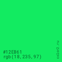Цвет #12EB61 в цветовой модели RGB обозначается тремя октетами (18, 235, 97) в десятичном формате и #12EB61 в шестнадцатиричном (hex) формате, которые являются интенсивностью красного 18 (hex 12), интенсивность зелёного 235 (hex EB) и интенсивность синего 97 (hex 61).