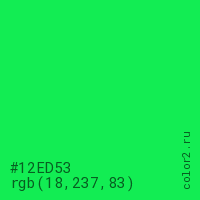 Цвет #12ED53 в цветовой модели RGB обозначается тремя октетами (18, 237, 83) в десятичном формате и #12ED53 в шестнадцатиричном (hex) формате, которые являются интенсивностью красного 18 (hex 12), интенсивность зелёного 237 (hex ED) и интенсивность синего 83 (hex 53).