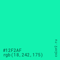 Цвет #12F2AF в цветовой модели RGB обозначается тремя октетами (18, 242, 175) в десятичном формате и #12F2AF в шестнадцатиричном (hex) формате, которые являются интенсивностью красного 18 (hex 12), интенсивность зелёного 242 (hex F2) и интенсивность синего 175 (hex AF).