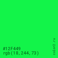 Цвет #12F449 в цветовой модели RGB обозначается тремя октетами (18, 244, 73) в десятичном формате и #12F449 в шестнадцатиричном (hex) формате, которые являются интенсивностью красного 18 (hex 12), интенсивность зелёного 244 (hex F4) и интенсивность синего 73 (hex 49).