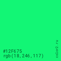 Цвет #12F675 в цветовой модели RGB обозначается тремя октетами (18, 246, 117) в десятичном формате и #12F675 в шестнадцатиричном (hex) формате, которые являются интенсивностью красного 18 (hex 12), интенсивность зелёного 246 (hex F6) и интенсивность синего 117 (hex 75).