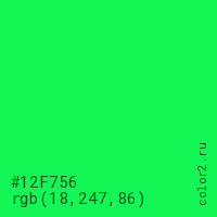 Цвет #12F756 в цветовой модели RGB обозначается тремя октетами (18, 247, 86) в десятичном формате и #12F756 в шестнадцатиричном (hex) формате, которые являются интенсивностью красного 18 (hex 12), интенсивность зелёного 247 (hex F7) и интенсивность синего 86 (hex 56).