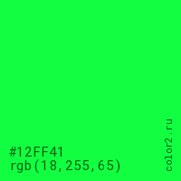 Цвет #12FF41 в цветовой модели RGB обозначается тремя октетами (18, 255, 65) в десятичном формате и #12FF41 в шестнадцатиричном (hex) формате, которые являются интенсивностью красного 18 (hex 12), интенсивность зелёного 255 (hex FF) и интенсивность синего 65 (hex 41).