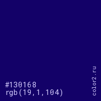 Цвет #130168 в цветовой модели RGB обозначается тремя октетами (19, 1, 104) в десятичном формате и #130168 в шестнадцатиричном (hex) формате, которые являются интенсивностью красного 19 (hex 13), интенсивность зелёного 1 (hex 01) и интенсивность синего 104 (hex 68).