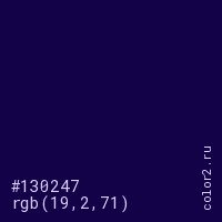 Цвет #130247 в цветовой модели RGB обозначается тремя октетами (19, 2, 71) в десятичном формате и #130247 в шестнадцатиричном (hex) формате, которые являются интенсивностью красного 19 (hex 13), интенсивность зелёного 2 (hex 02) и интенсивность синего 71 (hex 47).