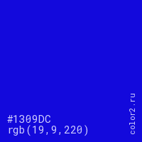 Цвет #1309DC в цветовой модели RGB обозначается тремя октетами (19, 9, 220) в десятичном формате и #1309DC в шестнадцатиричном (hex) формате, которые являются интенсивностью красного 19 (hex 13), интенсивность зелёного 9 (hex 09) и интенсивность синего 220 (hex DC).