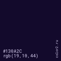 Цвет #130A2C в цветовой модели RGB обозначается тремя октетами (19, 10, 44) в десятичном формате и #130A2C в шестнадцатиричном (hex) формате, которые являются интенсивностью красного 19 (hex 13), интенсивность зелёного 10 (hex 0A) и интенсивность синего 44 (hex 2C).