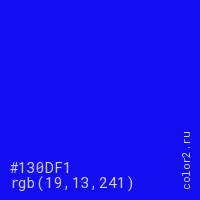 Цвет #130DF1 в цветовой модели RGB обозначается тремя октетами (19, 13, 241) в десятичном формате и #130DF1 в шестнадцатиричном (hex) формате, которые являются интенсивностью красного 19 (hex 13), интенсивность зелёного 13 (hex 0D) и интенсивность синего 241 (hex F1).