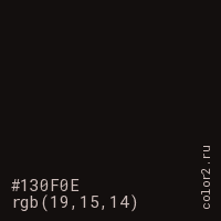 Цвет #130F0E в цветовой модели RGB обозначается тремя октетами (19, 15, 14) в десятичном формате и #130F0E в шестнадцатиричном (hex) формате, которые являются интенсивностью красного 19 (hex 13), интенсивность зелёного 15 (hex 0F) и интенсивность синего 14 (hex 0E).