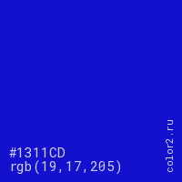 Цвет #1311CD в цветовой модели RGB обозначается тремя октетами (19, 17, 205) в десятичном формате и #1311CD в шестнадцатиричном (hex) формате, которые являются интенсивностью красного 19 (hex 13), интенсивность зелёного 17 (hex 11) и интенсивность синего 205 (hex CD).