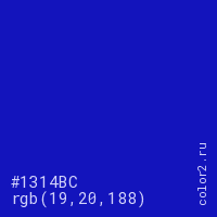 Цвет #1314BC в цветовой модели RGB обозначается тремя октетами (19, 20, 188) в десятичном формате и #1314BC в шестнадцатиричном (hex) формате, которые являются интенсивностью красного 19 (hex 13), интенсивность зелёного 20 (hex 14) и интенсивность синего 188 (hex BC).
