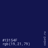 Цвет #13154F в цветовой модели RGB обозначается тремя октетами (19, 21, 79) в десятичном формате и #13154F в шестнадцатиричном (hex) формате, которые являются интенсивностью красного 19 (hex 13), интенсивность зелёного 21 (hex 15) и интенсивность синего 79 (hex 4F).