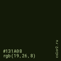 Цвет #131A08 в цветовой модели RGB обозначается тремя октетами (19, 26, 8) в десятичном формате и #131A08 в шестнадцатиричном (hex) формате, которые являются интенсивностью красного 19 (hex 13), интенсивность зелёного 26 (hex 1A) и интенсивность синего 8 (hex 08).