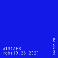 Цвет #131AE8 в цветовой модели RGB обозначается тремя октетами (19, 26, 232) в десятичном формате и #131AE8 в шестнадцатиричном (hex) формате, которые являются интенсивностью красного 19 (hex 13), интенсивность зелёного 26 (hex 1A) и интенсивность синего 232 (hex E8).