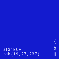Цвет #131BCF в цветовой модели RGB обозначается тремя октетами (19, 27, 207) в десятичном формате и #131BCF в шестнадцатиричном (hex) формате, которые являются интенсивностью красного 19 (hex 13), интенсивность зелёного 27 (hex 1B) и интенсивность синего 207 (hex CF).