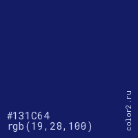 Цвет #131C64 в цветовой модели RGB обозначается тремя октетами (19, 28, 100) в десятичном формате и #131C64 в шестнадцатиричном (hex) формате, которые являются интенсивностью красного 19 (hex 13), интенсивность зелёного 28 (hex 1C) и интенсивность синего 100 (hex 64).