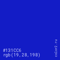 Цвет #131CC6 в цветовой модели RGB обозначается тремя октетами (19, 28, 198) в десятичном формате и #131CC6 в шестнадцатиричном (hex) формате, которые являются интенсивностью красного 19 (hex 13), интенсивность зелёного 28 (hex 1C) и интенсивность синего 198 (hex C6).