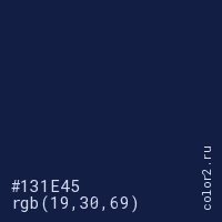 Цвет #131E45 в цветовой модели RGB обозначается тремя октетами (19, 30, 69) в десятичном формате и #131E45 в шестнадцатиричном (hex) формате, которые являются интенсивностью красного 19 (hex 13), интенсивность зелёного 30 (hex 1E) и интенсивность синего 69 (hex 45).