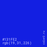 Цвет #131FE2 в цветовой модели RGB обозначается тремя октетами (19, 31, 226) в десятичном формате и #131FE2 в шестнадцатиричном (hex) формате, которые являются интенсивностью красного 19 (hex 13), интенсивность зелёного 31 (hex 1F) и интенсивность синего 226 (hex E2).