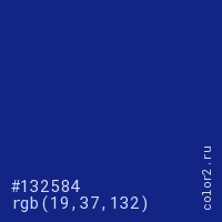 Цвет #132584 в цветовой модели RGB обозначается тремя октетами (19, 37, 132) в десятичном формате и #132584 в шестнадцатиричном (hex) формате, которые являются интенсивностью красного 19 (hex 13), интенсивность зелёного 37 (hex 25) и интенсивность синего 132 (hex 84).