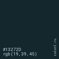 Цвет #13272D в цветовой модели RGB обозначается тремя октетами (19, 39, 45) в десятичном формате и #13272D в шестнадцатиричном (hex) формате, которые являются интенсивностью красного 19 (hex 13), интенсивность зелёного 39 (hex 27) и интенсивность синего 45 (hex 2D).