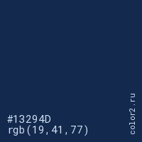 Цвет #13294D в цветовой модели RGB обозначается тремя октетами (19, 41, 77) в десятичном формате и #13294D в шестнадцатиричном (hex) формате, которые являются интенсивностью красного 19 (hex 13), интенсивность зелёного 41 (hex 29) и интенсивность синего 77 (hex 4D).
