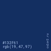 Цвет #132F61 в цветовой модели RGB обозначается тремя октетами (19, 47, 97) в десятичном формате и #132F61 в шестнадцатиричном (hex) формате, которые являются интенсивностью красного 19 (hex 13), интенсивность зелёного 47 (hex 2F) и интенсивность синего 97 (hex 61).