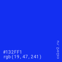 Цвет #132FF1 в цветовой модели RGB обозначается тремя октетами (19, 47, 241) в десятичном формате и #132FF1 в шестнадцатиричном (hex) формате, которые являются интенсивностью красного 19 (hex 13), интенсивность зелёного 47 (hex 2F) и интенсивность синего 241 (hex F1).