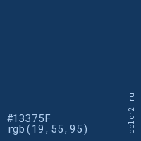 Цвет #13375F в цветовой модели RGB обозначается тремя октетами (19, 55, 95) в десятичном формате и #13375F в шестнадцатиричном (hex) формате, которые являются интенсивностью красного 19 (hex 13), интенсивность зелёного 55 (hex 37) и интенсивность синего 95 (hex 5F).