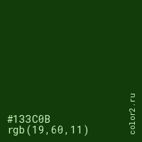 Цвет #133C0B в цветовой модели RGB обозначается тремя октетами (19, 60, 11) в десятичном формате и #133C0B в шестнадцатиричном (hex) формате, которые являются интенсивностью красного 19 (hex 13), интенсивность зелёного 60 (hex 3C) и интенсивность синего 11 (hex 0B).