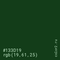 Цвет #133D19 в цветовой модели RGB обозначается тремя октетами (19, 61, 25) в десятичном формате и #133D19 в шестнадцатиричном (hex) формате, которые являются интенсивностью красного 19 (hex 13), интенсивность зелёного 61 (hex 3D) и интенсивность синего 25 (hex 19).