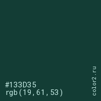 Цвет #133D35 в цветовой модели RGB обозначается тремя октетами (19, 61, 53) в десятичном формате и #133D35 в шестнадцатиричном (hex) формате, которые являются интенсивностью красного 19 (hex 13), интенсивность зелёного 61 (hex 3D) и интенсивность синего 53 (hex 35).