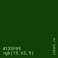 Цвет #133F09 в цветовой модели RGB обозначается тремя октетами (19, 63, 9) в десятичном формате и #133F09 в шестнадцатиричном (hex) формате, которые являются интенсивностью красного 19 (hex 13), интенсивность зелёного 63 (hex 3F) и интенсивность синего 9 (hex 09).