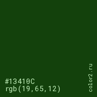 Цвет #13410C в цветовой модели RGB обозначается тремя октетами (19, 65, 12) в десятичном формате и #13410C в шестнадцатиричном (hex) формате, которые являются интенсивностью красного 19 (hex 13), интенсивность зелёного 65 (hex 41) и интенсивность синего 12 (hex 0C).