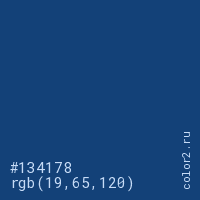Цвет #134178 в цветовой модели RGB обозначается тремя октетами (19, 65, 120) в десятичном формате и #134178 в шестнадцатиричном (hex) формате, которые являются интенсивностью красного 19 (hex 13), интенсивность зелёного 65 (hex 41) и интенсивность синего 120 (hex 78).