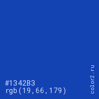 Цвет #1342B3 в цветовой модели RGB обозначается тремя октетами (19, 66, 179) в десятичном формате и #1342B3 в шестнадцатиричном (hex) формате, которые являются интенсивностью красного 19 (hex 13), интенсивность зелёного 66 (hex 42) и интенсивность синего 179 (hex B3).