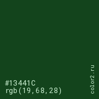 Цвет #13441C в цветовой модели RGB обозначается тремя октетами (19, 68, 28) в десятичном формате и #13441C в шестнадцатиричном (hex) формате, которые являются интенсивностью красного 19 (hex 13), интенсивность зелёного 68 (hex 44) и интенсивность синего 28 (hex 1C).