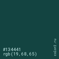Цвет #134441 в цветовой модели RGB обозначается тремя октетами (19, 68, 65) в десятичном формате и #134441 в шестнадцатиричном (hex) формате, которые являются интенсивностью красного 19 (hex 13), интенсивность зелёного 68 (hex 44) и интенсивность синего 65 (hex 41).