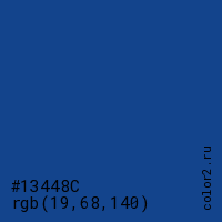 Цвет #13448C в цветовой модели RGB обозначается тремя октетами (19, 68, 140) в десятичном формате и #13448C в шестнадцатиричном (hex) формате, которые являются интенсивностью красного 19 (hex 13), интенсивность зелёного 68 (hex 44) и интенсивность синего 140 (hex 8C).