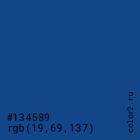 Цвет #134589 в цветовой модели RGB обозначается тремя октетами (19, 69, 137) в десятичном формате и #134589 в шестнадцатиричном (hex) формате, которые являются интенсивностью красного 19 (hex 13), интенсивность зелёного 69 (hex 45) и интенсивность синего 137 (hex 89).
