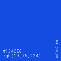 Цвет #134CE0 в цветовой модели RGB обозначается тремя октетами (19, 76, 224) в десятичном формате и #134CE0 в шестнадцатиричном (hex) формате, которые являются интенсивностью красного 19 (hex 13), интенсивность зелёного 76 (hex 4C) и интенсивность синего 224 (hex E0).