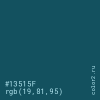 Цвет #13515F в цветовой модели RGB обозначается тремя октетами (19, 81, 95) в десятичном формате и #13515F в шестнадцатиричном (hex) формате, которые являются интенсивностью красного 19 (hex 13), интенсивность зелёного 81 (hex 51) и интенсивность синего 95 (hex 5F).