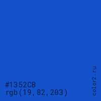 Цвет #1352CB в цветовой модели RGB обозначается тремя октетами (19, 82, 203) в десятичном формате и #1352CB в шестнадцатиричном (hex) формате, которые являются интенсивностью красного 19 (hex 13), интенсивность зелёного 82 (hex 52) и интенсивность синего 203 (hex CB).