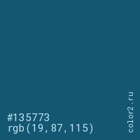 Цвет #135773 в цветовой модели RGB обозначается тремя октетами (19, 87, 115) в десятичном формате и #135773 в шестнадцатиричном (hex) формате, которые являются интенсивностью красного 19 (hex 13), интенсивность зелёного 87 (hex 57) и интенсивность синего 115 (hex 73).