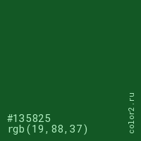 Цвет #135825 в цветовой модели RGB обозначается тремя октетами (19, 88, 37) в десятичном формате и #135825 в шестнадцатиричном (hex) формате, которые являются интенсивностью красного 19 (hex 13), интенсивность зелёного 88 (hex 58) и интенсивность синего 37 (hex 25).