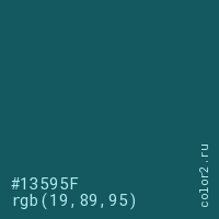 Цвет #13595F в цветовой модели RGB обозначается тремя октетами (19, 89, 95) в десятичном формате и #13595F в шестнадцатиричном (hex) формате, которые являются интенсивностью красного 19 (hex 13), интенсивность зелёного 89 (hex 59) и интенсивность синего 95 (hex 5F).