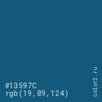 Цвет #13597C в цветовой модели RGB обозначается тремя октетами (19, 89, 124) в десятичном формате и #13597C в шестнадцатиричном (hex) формате, которые являются интенсивностью красного 19 (hex 13), интенсивность зелёного 89 (hex 59) и интенсивность синего 124 (hex 7C).