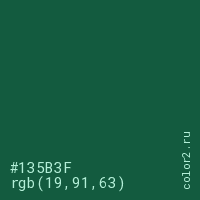 Цвет #135B3F в цветовой модели RGB обозначается тремя октетами (19, 91, 63) в десятичном формате и #135B3F в шестнадцатиричном (hex) формате, которые являются интенсивностью красного 19 (hex 13), интенсивность зелёного 91 (hex 5B) и интенсивность синего 63 (hex 3F).
