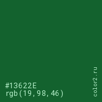Цвет #13622E в цветовой модели RGB обозначается тремя октетами (19, 98, 46) в десятичном формате и #13622E в шестнадцатиричном (hex) формате, которые являются интенсивностью красного 19 (hex 13), интенсивность зелёного 98 (hex 62) и интенсивность синего 46 (hex 2E).
