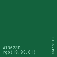 Цвет #13623D в цветовой модели RGB обозначается тремя октетами (19, 98, 61) в десятичном формате и #13623D в шестнадцатиричном (hex) формате, которые являются интенсивностью красного 19 (hex 13), интенсивность зелёного 98 (hex 62) и интенсивность синего 61 (hex 3D).